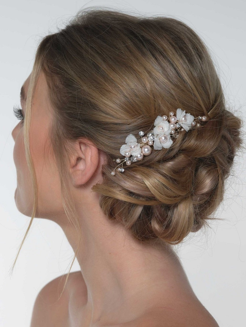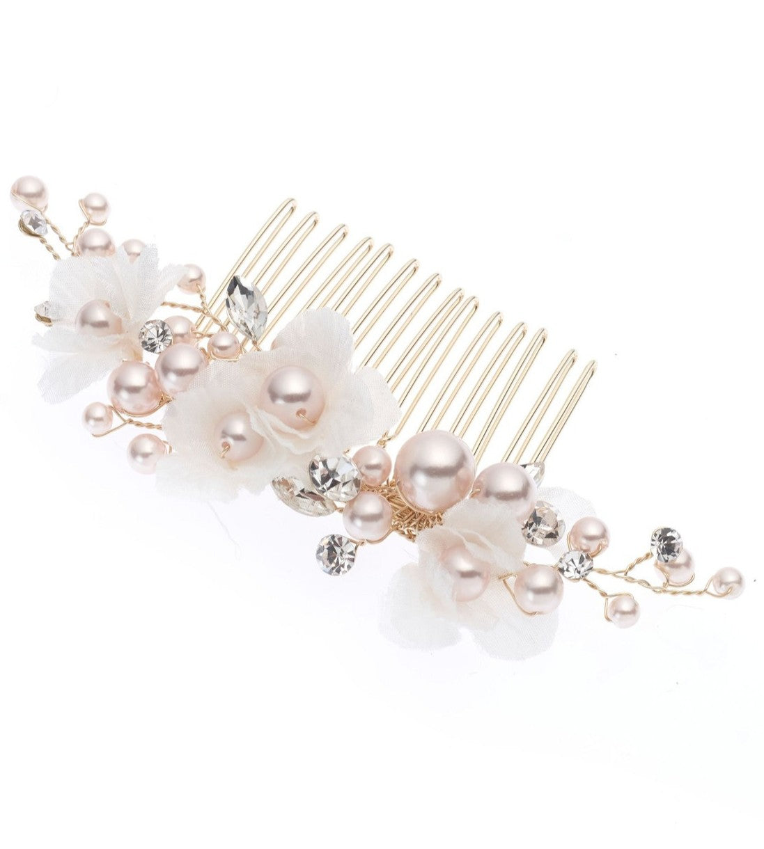 wunderhübscher, elfenbein-rose-goldfarbener Haarkamm mit Stoffblüten, Perlen und Strasssteinchen verziert.