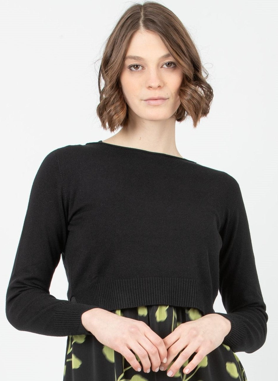 Raffiniert geschnittenes zwei-teiliges Umstandskeid, d. h. du hast ein gemustertes Kleid mit Stillöffnung sowie einen schwarzen, cropped Pullover für kühlere Tage zum darüber ziehen - wie cool ist das denn? .... unser Favourite - so nice!