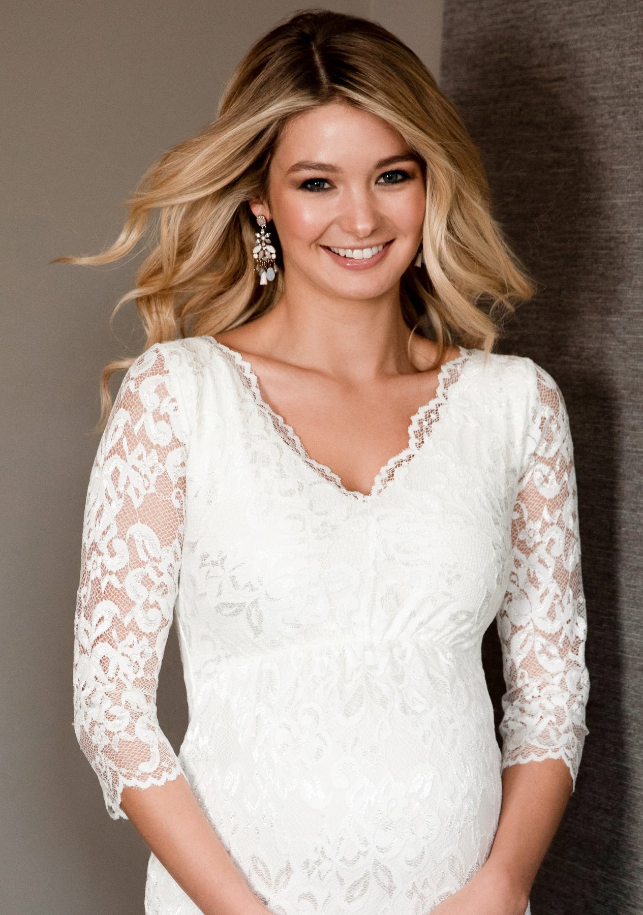 Das Besondere ist der schön gebogte Spitzenabschluss um den V-Ausschnitt, die Ärmel und um den Rocksaum. Das Viskose-Jersey-Futter fühlt sich weich und geschmeidig an, sorgt für Komfort und umspielt sanft deinen Babybauch.