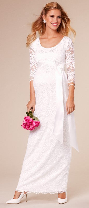 Ein klassisches Umstands-Brautkleid mit wunderschönen Spitzendetails .... unser Kleid Katie ist ein wahrer Hingucker! Der schmal gehaltene, bodenlange Rock, mit gegebogtem Saumabschluss, ist durch den klassischen Rundhalsausschnitt und die schmeichelnden drei Viertel Ärmel perfekt ausbalanciert. Die passende Satinschärpe, bitte extra dazu bestellen, definiert Ihre Silhouette auf schmeichelhafte Weise und lässt das Kleid noch festlicher und edler erscheinen; Das Kleid ist aus unserem erstklassigen, weichem Jersey komplett durchgefüttert und durch die elastische Spitze sooo bequem!! Katie vereint Luxus und Eleganz. Stylen Sie Ihren Look mit einem schlichten Rosenstrauß und süßen Heels.