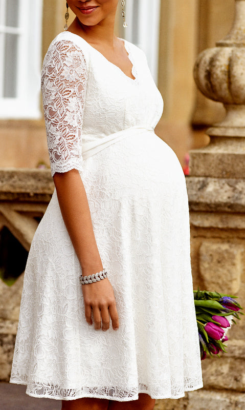 Ein wunderschönes Umstandsbrautkleid für deinen besonderen Tag ... die schmale Taille, der weit schwingende Rock, der schicke V-Ausschnitt, vorne und hinten mit gebogter Spitze, die dein Dekolleté toll in Szene setzt, verzaubern bei diesem traumhaften Modell aus weicher, elastischer Spitze. Das Kleid ist gefüttert, die Rocklänge von unter der Brust bis zum Saum beträgt ca. 66cm.