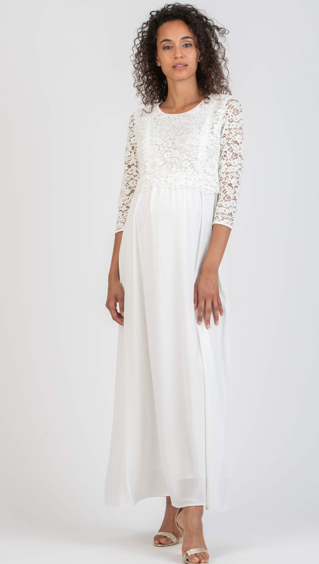 .... super-schönes Schwangerschaftsbrautkleid mit Spitzenoberteil, 3/4-Ärmeln, glattem, fließender Rock der sich jeder Bauchgröße anpasst sowie genial versteckter Stillöffnung, so daß das Kleid auch zu anderen Anlässen, wie z. B. zur Taufe usw., dann gekürzt oder eingefärbt, weiter getragen werden kann .....