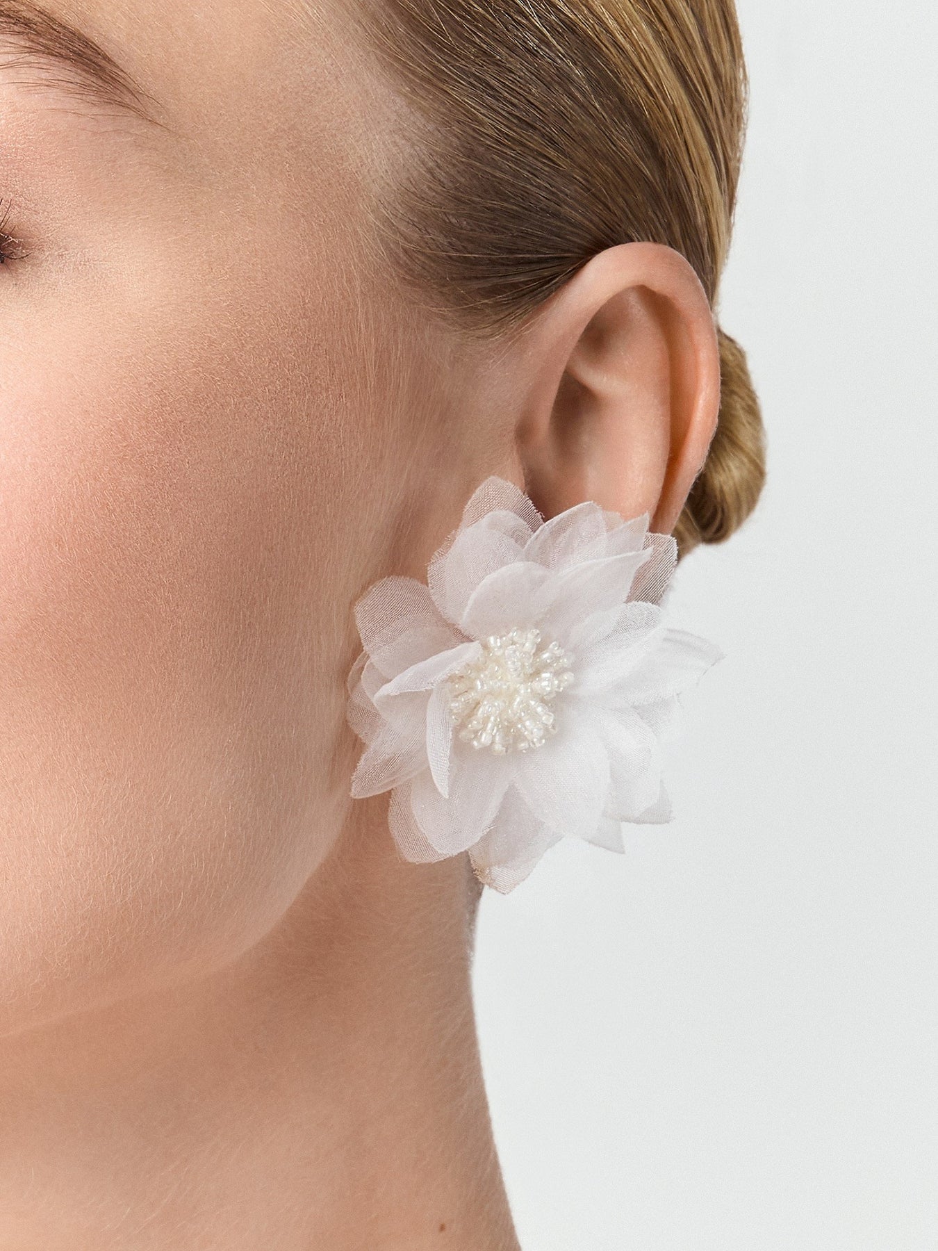 Für die moderne Braut: zarte Tüllohrringe in Blütenform mit kleinen Perlen verziert. So nice!