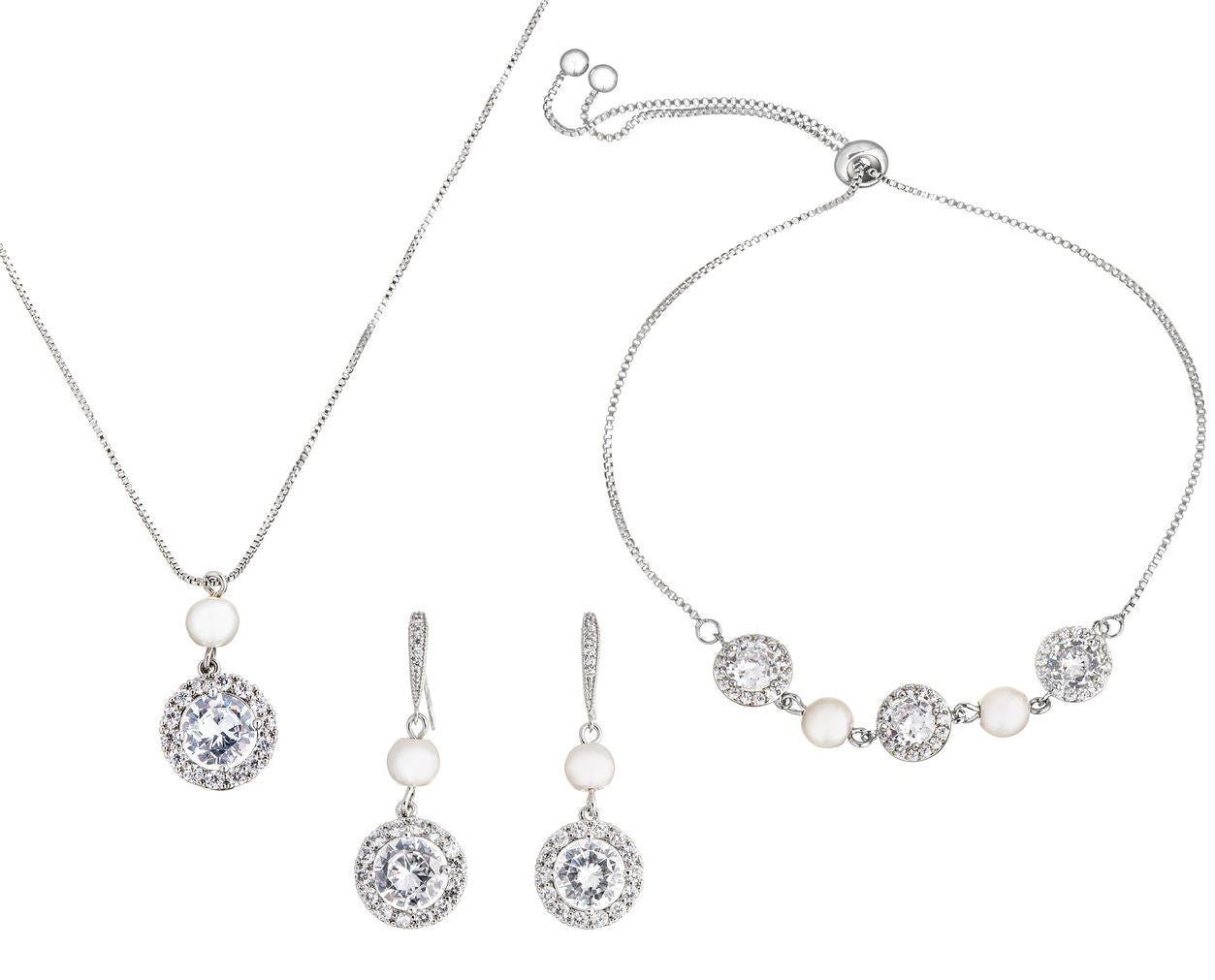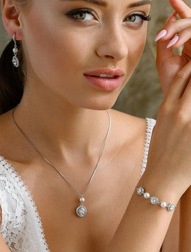Elegantes, wunderschönes Brautschmuck-Set: Halskette, Ohrringe und passendes Armband, verziert mit Cubic Circonia-Kristallen und cremefarbenen Perlen, rhodiniert!