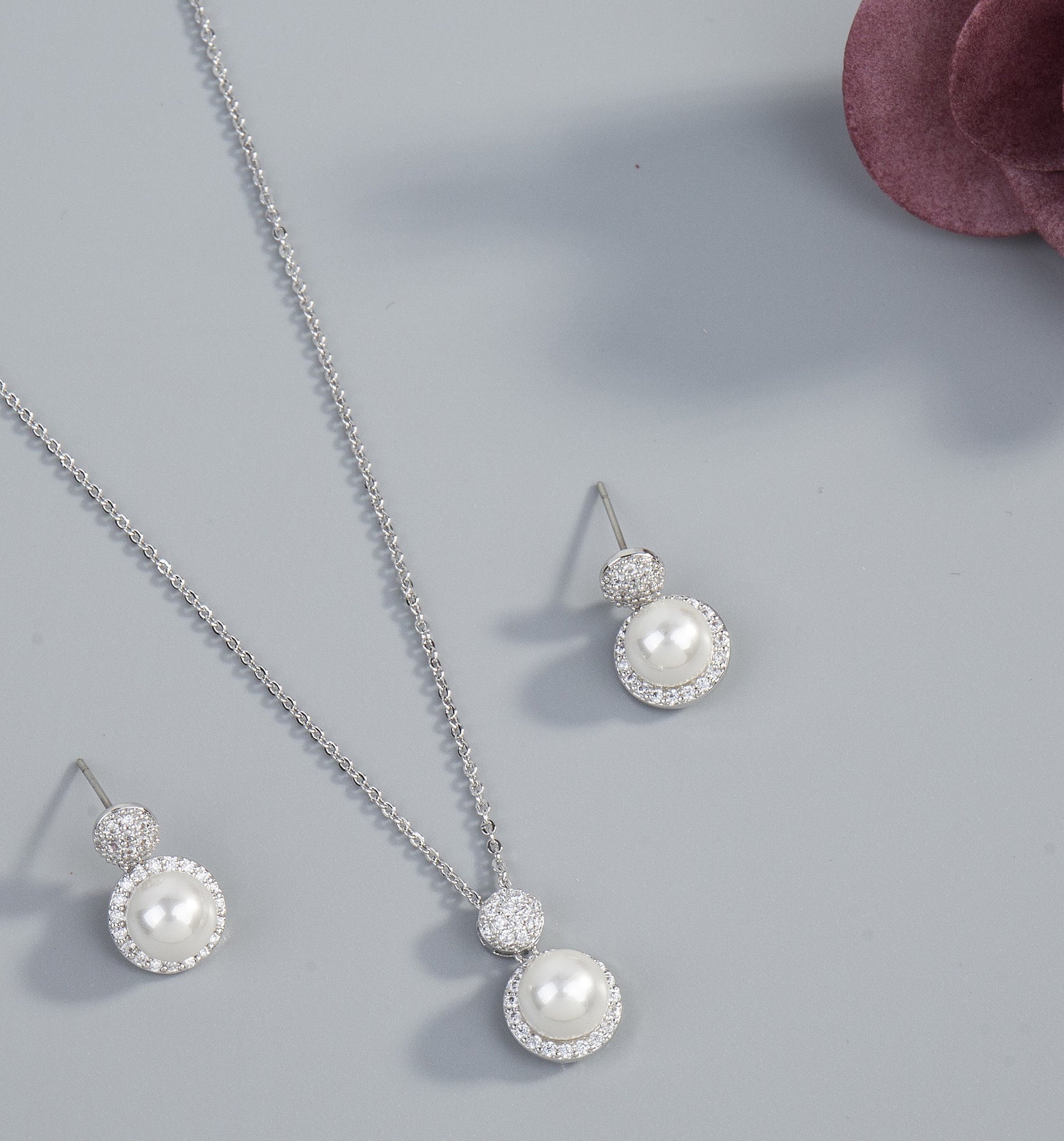 Elegant, raffiniertes Schmuckset aus kleinen Zirkonia-Kristallen und feinen Perlen. Das Schmuckset besteht aus nicht allergischen Materialien (nickel- und bleifrei) und ist rhodiniert. Im Vergleich zu Silber ist Rhodium sehr reaktionsträge.