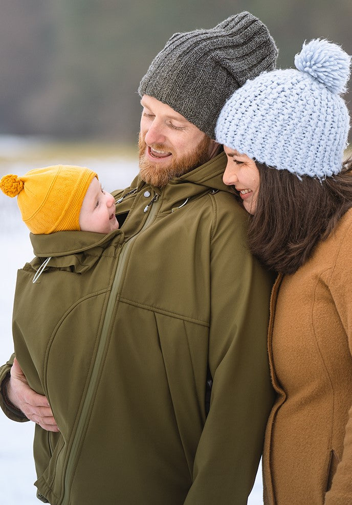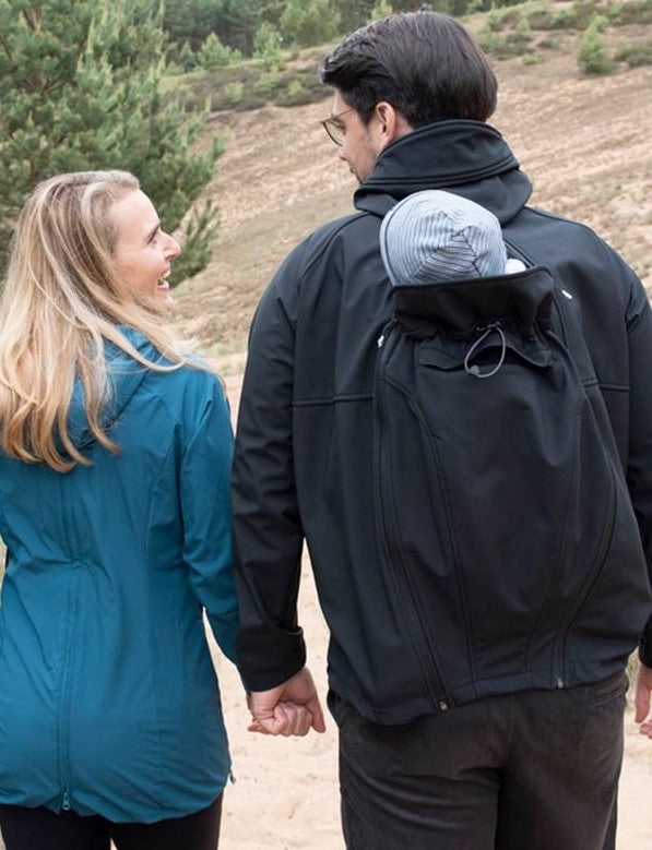 Der Babyeinsatz kann vorne oder im Rücken der Jacke mit einem Handgriff eingezippt werden und verwandelt die Softshelljacke für Männer in eine Tragejacke. Ganz ohne Einsätze kann sie natürlich wie eine ganz normale Jacke getragen werden.