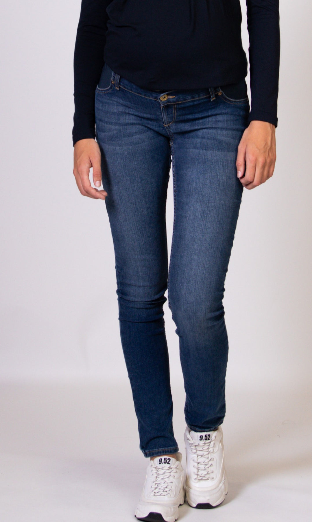 Umstandsjeans als Unterbauchmodell, mit seitlichem Gummibundeinsatz und innen liegender Weitenregulierung, die angegebenen Größen sind deutsche Konfektionsgrößen.