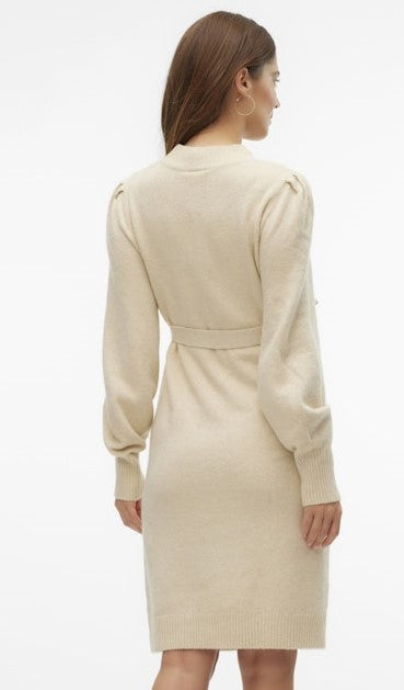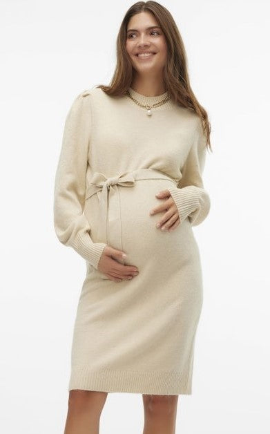 wunderschönes Strickkleid in feinem Vanille-Farbton, mit einem Bindeband, dass deine Taille und deinen Babybauch hübsch betont und nach vorne oder hinten gebunden werden kann. Die neue, moderne Ärmelform sowie der kleine Stehkragen geben dem kuschelweichen, bequemen Winterkleid Stil und Schick!