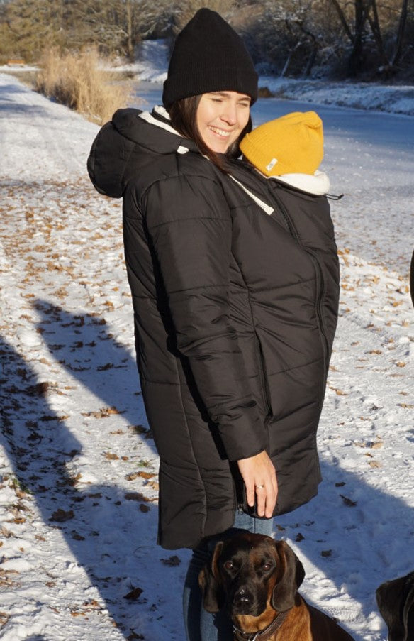 Ein superwarmer Stepp-Wintermantel für die Schwangerschaft, zum Babytragen und danach: der wärmste Mantel lädt zum Weihnachtsmarktbummel mit Kind in der Trage oder Babybauch ein. Die extra dicke Steppung ist nicht nur gemütlich, sondern hält wunderbar warm und ist federleicht - alleine oder zu zweit. Nachhaltig und fair hergestellt.